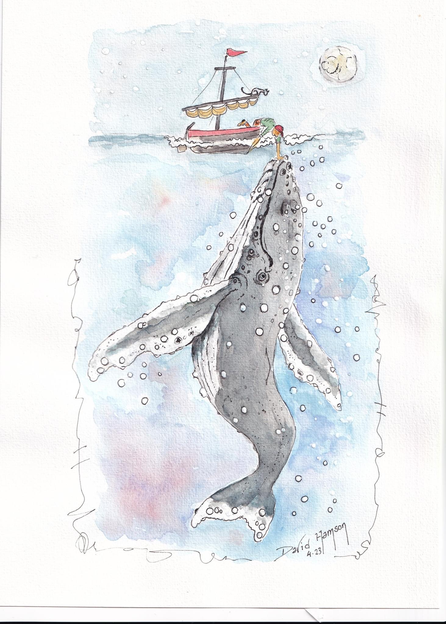 Watercolour painting of a boy with his best friend. Watercolour annd acrylic, and salt.