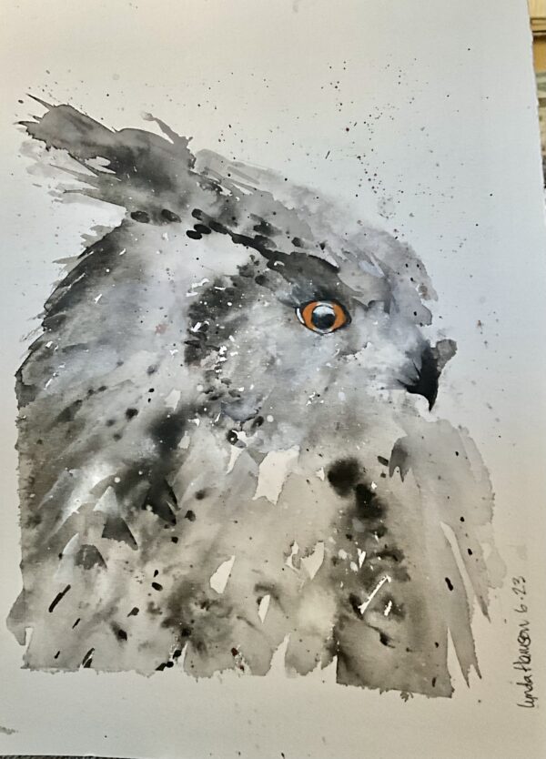 Lovely watercolour painting of a grey owl.