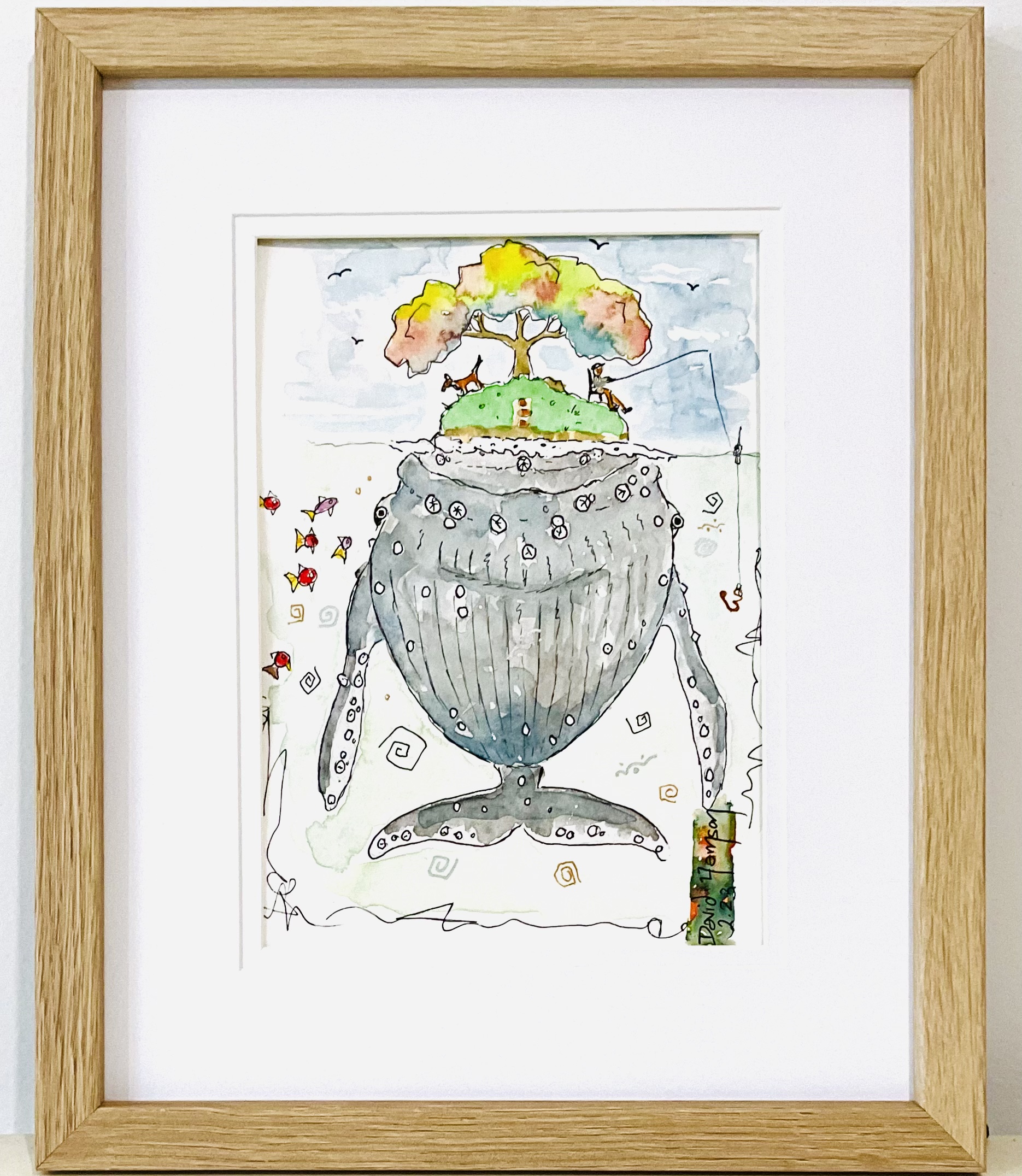 Here is a watercolour painting of a Humpback whale with an Island on the top.